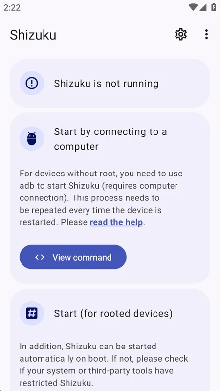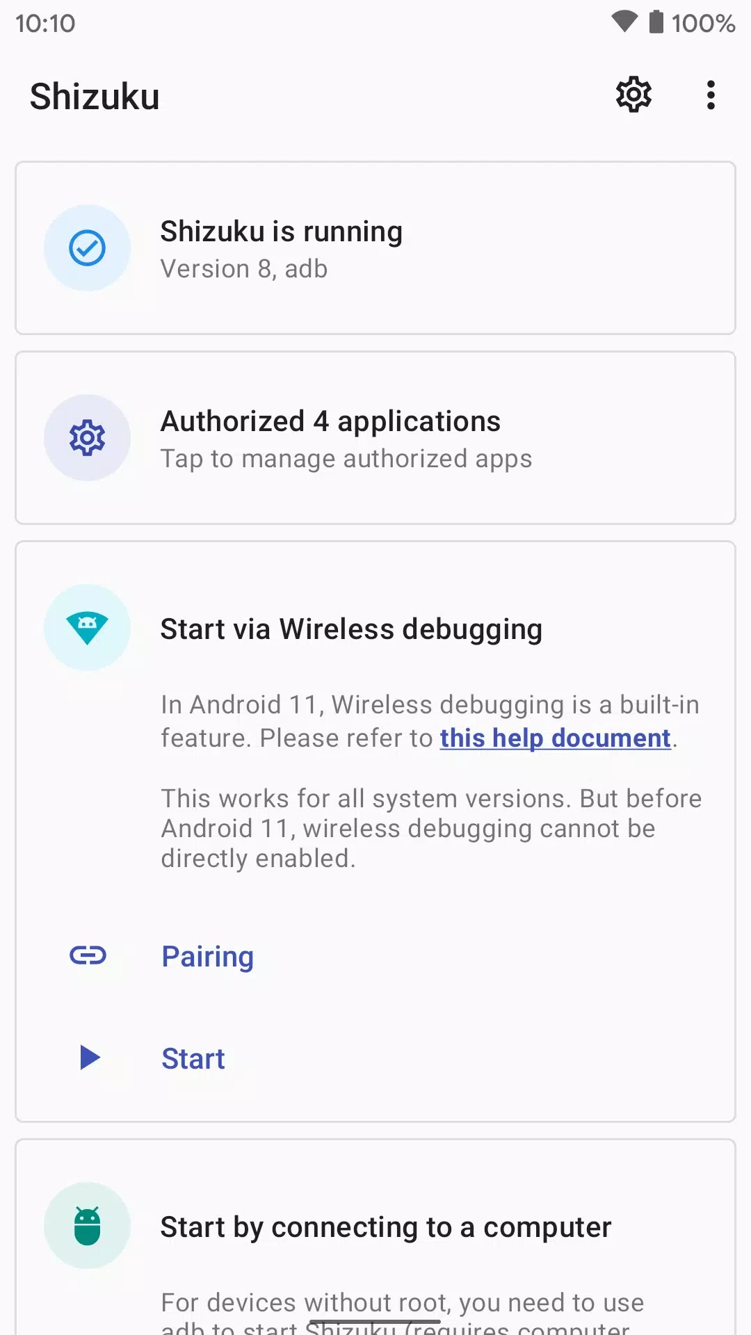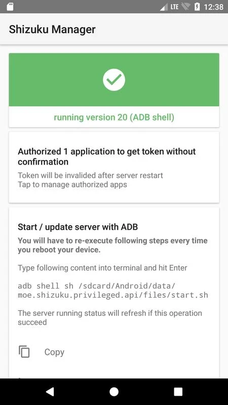 Aplikasi ini mendukung dua metode untuk memulai server Shizuku: ADB untuk pengaturan tanpa root, atau dengan root jika tersedia. Memulai ulang perangkat Anda akan memberikan awal yang cepat untuk mode ADB. Sedangkan, memulai ulang dengan mudah dimungkinkan dengan mode root, dan Anda dapat memilih metode sesuai kebutuhan Anda.